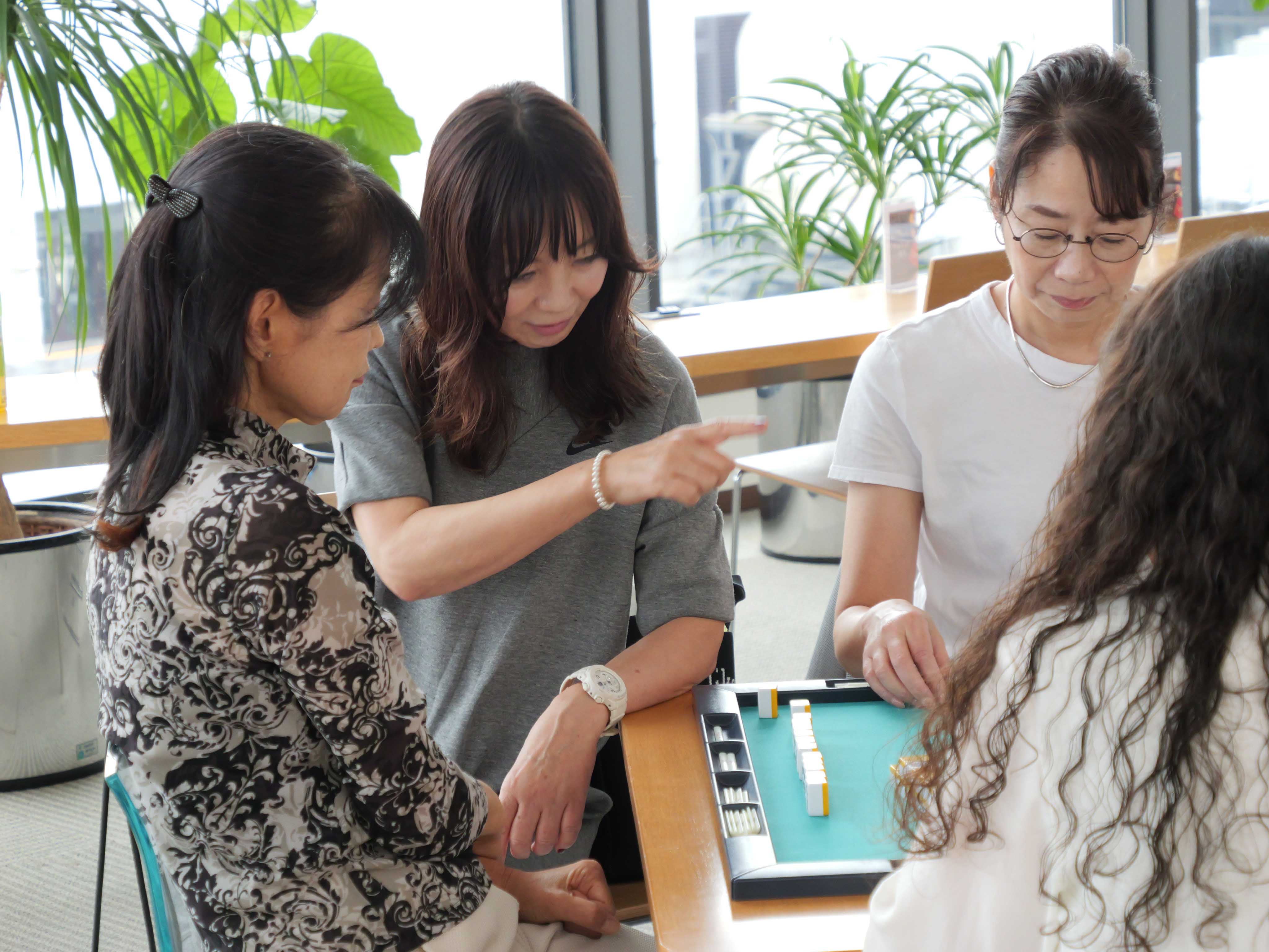 みなさん、すでに 牌の積み方もとてもスムーズで、ドラや役牌の理解も進んでおり、学びの基礎がしっかりできている印象でした。